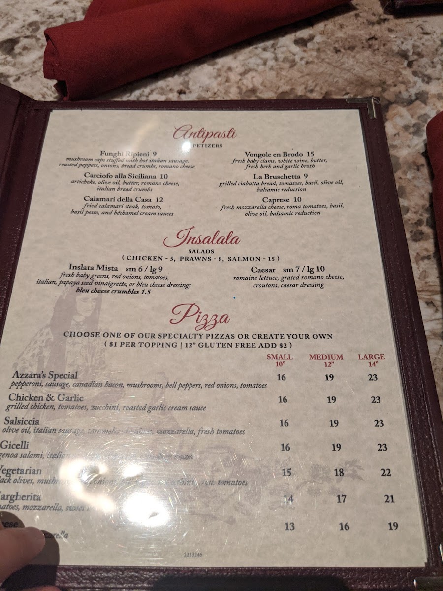 Welcome to Azzara's, a charming gem nestled in Incline Village, NV, where authentic Italian flavors come to life. Offering a diverse menu, Azzara's specializes in seafood delicacies and classic pasta dishes that transport your taste buds directly to Italy. Indulge in the Ravioli Di Aragosta, featuring rich Maine lobster enveloped in delicate ravioli, or savor the freshness of Linguine Con Vongole with tender clams sautéed in fragrant garlic and herbs.